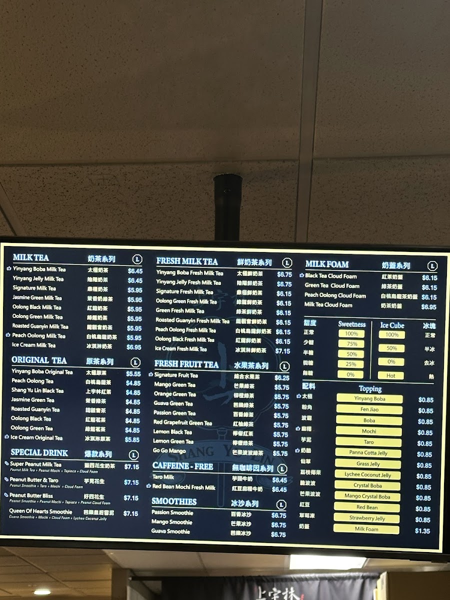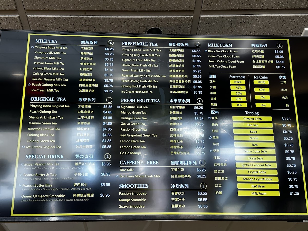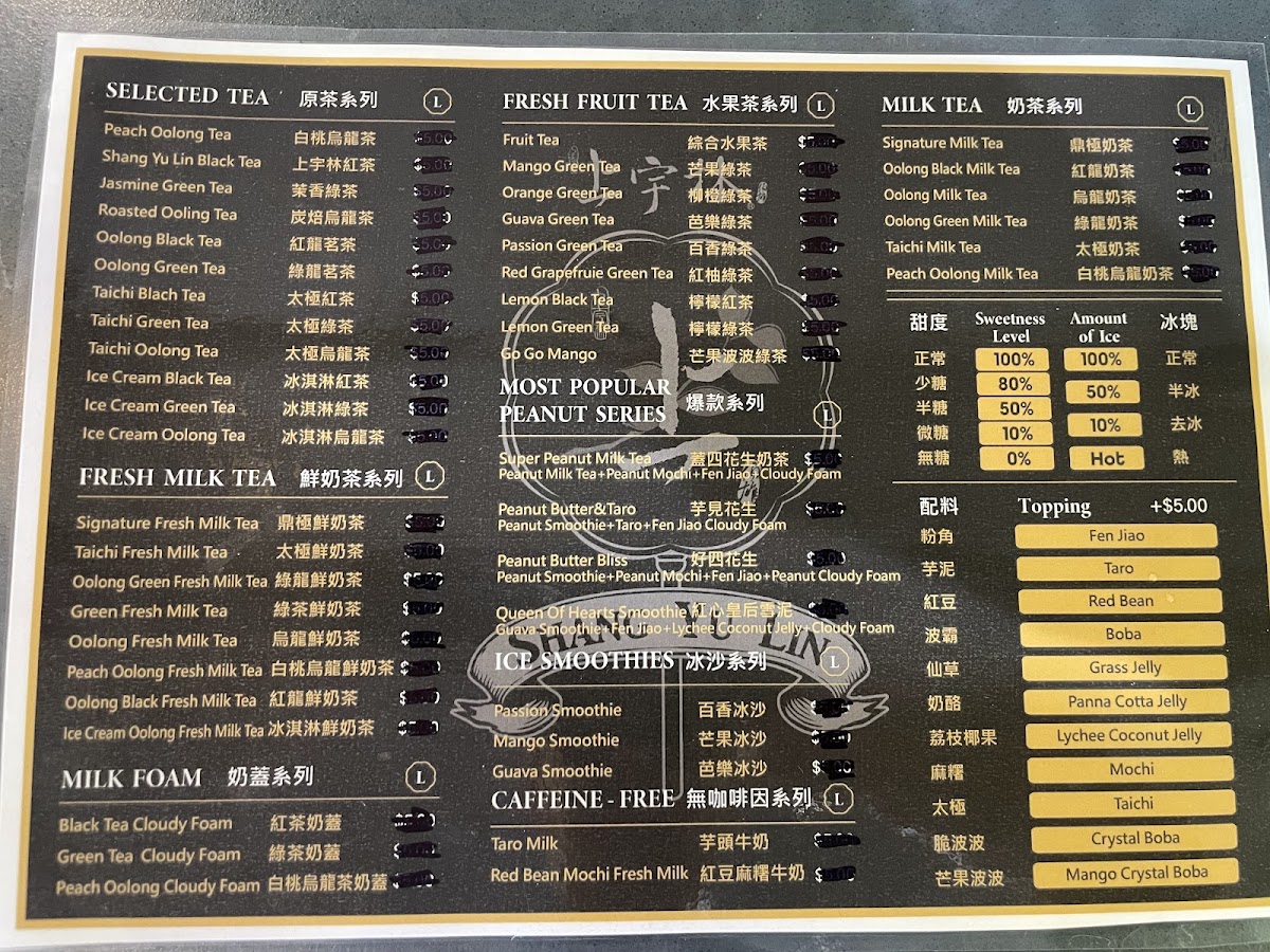 From a reviewer’s perspective, the menu at Shang Yu Lin-Cupertino offers an impressive variety of drinks, snacks, and desserts, with a strong focus on Taiwanese tea specialties and creative milk-based beverages. The milk tea selection is a highlight, especially the Signature Black Milk Tea and Roasted Guanyin Milk Tea, while fruitier options like Peach Oolong Milk Tea add a refreshing twist. The snack section features Taiwanese favorites such as Popcorn Chicken and Fried Oyster Mushroom, which pair well with drinks. Seasonal and promotional items like YinYang Boba Green Tea and the strawberry-themed Strawberry Milk Smash bring variety to the menu, while desserts such as Super Peanut Mochi and Taro Pork Floss Cake (2 Pieces) provide a satisfying sweet finish. The weekend special Soft-Centered Chocolate Nama Basque at $7.99 is a standout deal, and even small details like the Bag for $0.10 are clearly listed. Overall, the menu is extensive, with standout items like Signature Fruit Tea, Yin Yang Jelly Fresh Milk Tea, and Oolong Green Fresh Milk Tea, making it a great spot for both classic tea lovers and those looking to try unique Taiwanese-style drinks and treats.