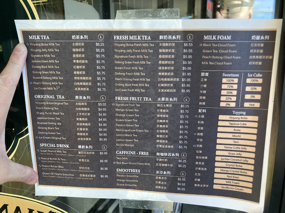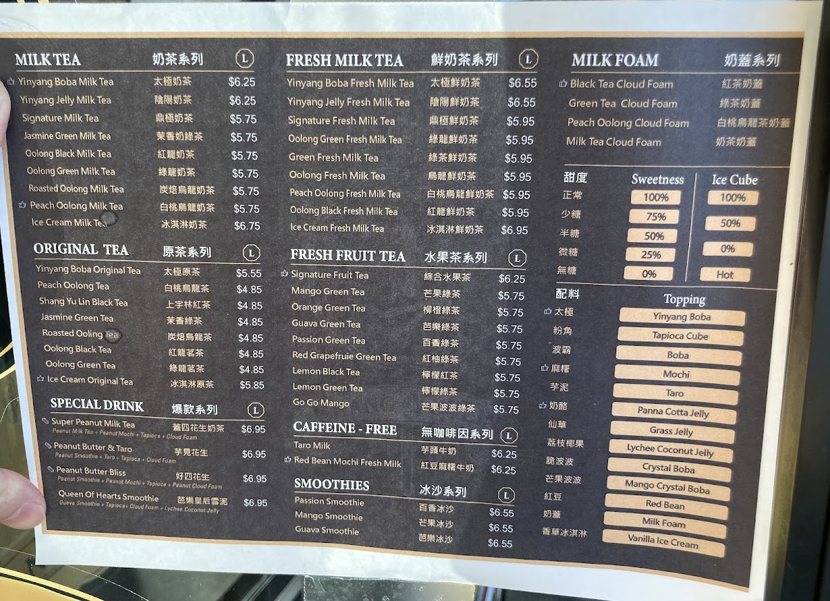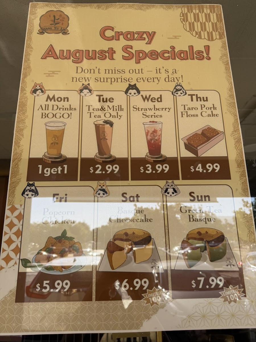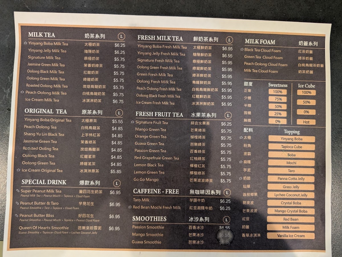 From a reviewer’s perspective, the menu at Shang Yu Lin-Cupertino offers an impressive variety of drinks, snacks, and desserts, with a strong focus on Taiwanese tea specialties and creative milk-based beverages. The milk tea selection is a highlight, especially the Signature Black Milk Tea and Roasted Guanyin Milk Tea, while fruitier options like Peach Oolong Milk Tea add a refreshing twist. The snack section features Taiwanese favorites such as Popcorn Chicken and Fried Oyster Mushroom, which pair well with drinks. Seasonal and promotional items like YinYang Boba Green Tea and the strawberry-themed Strawberry Milk Smash bring variety to the menu, while desserts such as Super Peanut Mochi and Taro Pork Floss Cake (2 Pieces) provide a satisfying sweet finish. The weekend special Soft-Centered Chocolate Nama Basque at $7.99 is a standout deal, and even small details like the Bag for $0.10 are clearly listed. Overall, the menu is extensive, with standout items like Signature Fruit Tea, Yin Yang Jelly Fresh Milk Tea, and Oolong Green Fresh Milk Tea, making it a great spot for both classic tea lovers and those looking to try unique Taiwanese-style drinks and treats.